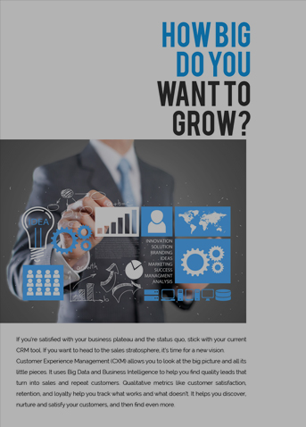 If you're satisfied with your business plateau and the status quo, stick with your current CRM tool. If you want to head to the sales stratosphere, it's time for a new vision. Customer Experience Management (CXM) allows you to look at the big picture and all its little pieces. It uses Big Data and Business Intelligence to help you find quality leads that turn into sales and repeat customers. Qualitative metrics like customer satisfaction, retention, and loyalty help you track what works and what doesn't. It helps you discover, nurture and satisfy your customers, and then find even more.
